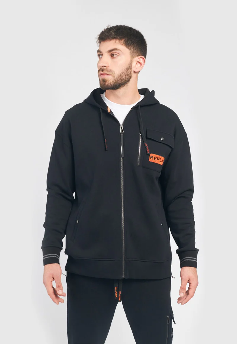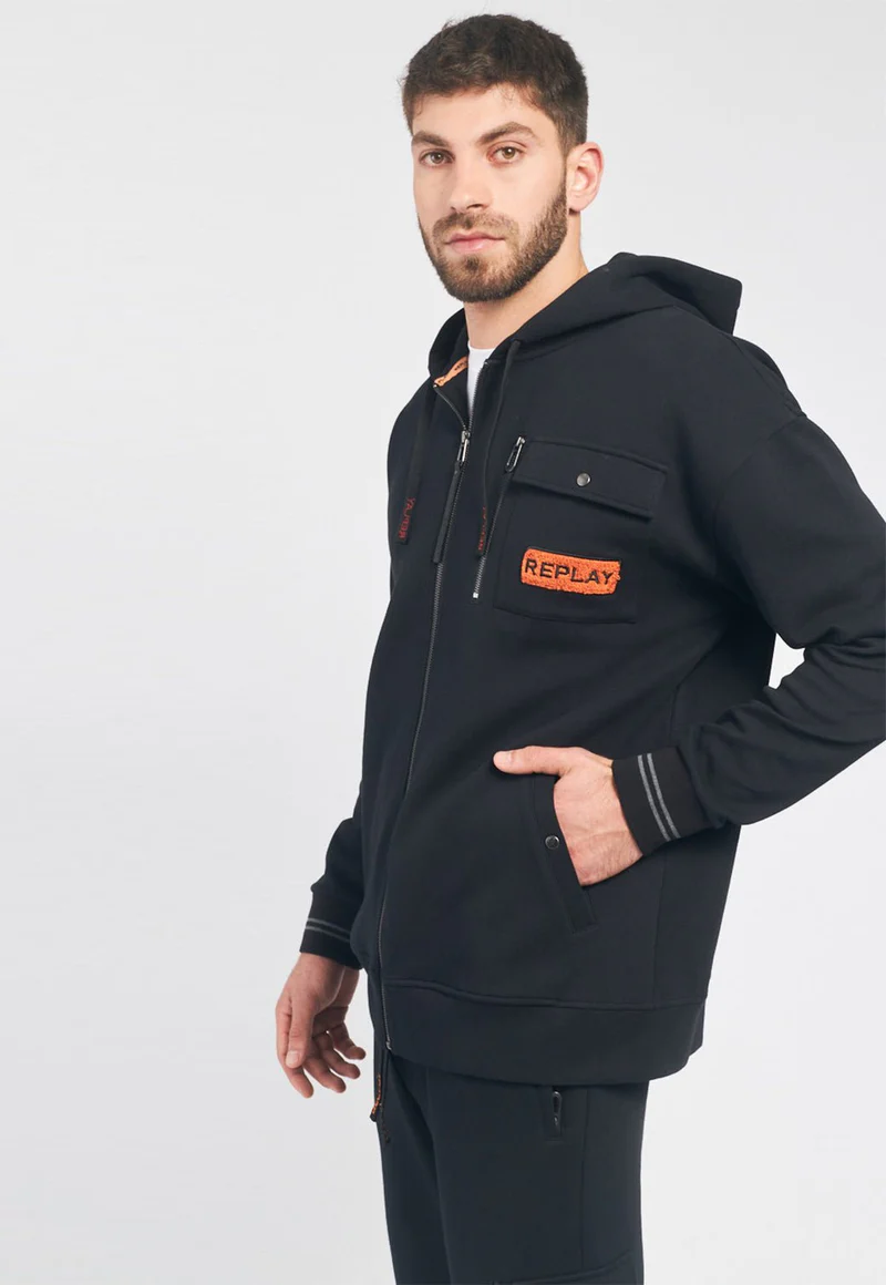 סווטשירט קפוצ'ון מרוכסן עם כיס מעטפה בחזית ולצידו כיס מרוכסן. לסווטשירט שני כיסים צידיים בגירת תיקתקים והדפס בגב בשילוב פאץ' פלאפי. גברים